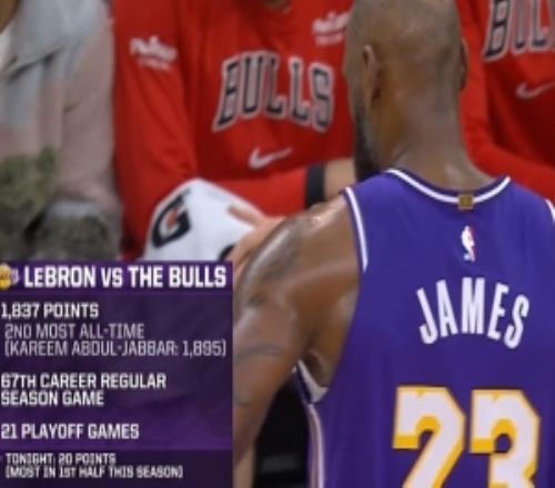 詹姆斯生涯对阵公牛1837分仅次于贾巴尔1895分常规赛对阵公牛67场 季后赛对阵公牛21场本场上半场已经拿到20...