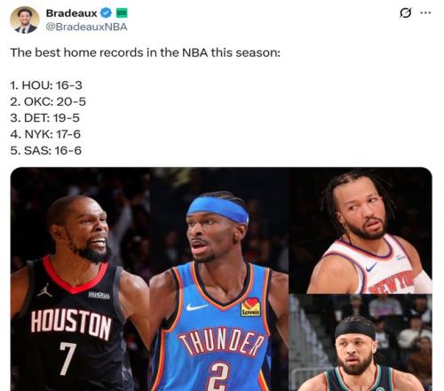 尤其是在主场战绩方面,火箭队以16胜3负的傲人发挥力压20胜5负的雷霆队高居联盟第一,东部第一活塞以19胜5负排在联盟第三,尼克斯17胜6负第四,马刺16胜6负位列第五。